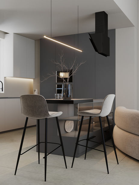 Στο παραπάνω διαμέρισμα ενσαρκώνεται η εναρμόνιση αντιθέσεων στον κόσμο της αρχιτεκτονικής. Με χρήση θερμών και ψυχρών αποχρώσεων, δημιουργείται ένας χώρος που εκπέμπει τόσο ηρεμία όσο και λειτουργικότητα. Το φως που διαχέεται από τα μεγάλα ανοίγματα διαδραματίζει καθοριστικό ρόλο στη διαμόρφωση μιας ευχάριστης και ζεστής, ταυτόχρονα, ατμόσφαιρας. Ο λιτός και καθαρός σχεδιασμός αναδεικνύει με τη σειρά του την αισθητική της απλότητας και της μινιμαλιστικής κομψότητας. Σε κάθε γωνιά της κατοικίας αποδεικνύεται η μεθοδικότητα με την οποία προσεγγίστηκε από την αρχή η οργάνωση και επιμέλεια των χώρων.