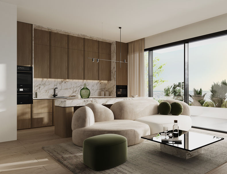 Το παρόν διαμέρισμα ενσαρκώνει τη σύγχρονη πολυτέλεια μέσα από τον επιμελημένο σχεδιασμό και την επιλογή εκλεπτυσμένων υλικών, στοιχεία που καταφέρνουν να του προσδώσουν ιδιαίτερο χαρακτήρα και αισθητική αρτιότητα. Παρά το περιορισμένο του μέγεθος, η κατοικία αποπνέει αίσθηση ευρυχωρίας χάρη στην open-plan διαρρύθμιση και το άφθονο φυσικό φως που διαχέεται σε όλη την επιφάνεια. Κυρίαρχο υλικό στην εσωτερική διακόσμηση είναι το μάρμαρο, το οποίο χρησιμοποιείται ευρέως σε επιφάνειες και λεπτομέρειες, προσδίδοντας μια αίσθηση διαχρονικής κομψότητας και πολυτέλειας. Τα μεγάλα ανοίγματα που τοποθετούνται στον ενιαίο χώρο καθιστικού και κουζίνας επιτρέπουν αφενός το φως να πλημμυρίζει το διαμέρισμα και αφετέρου να προσφέρουν ανεμπόδιστη θέα προς την πόλη, συνδέοντας το εσωτερικό με το αστικό τοπίο.