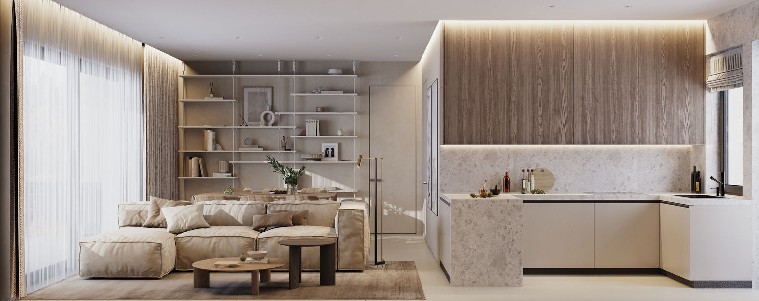 Η αντίθεση ανάμεσα στα δρύινα φυσικά υλικά των δαπέδων με το λευκό των κατασκευών αποτελεί βασικό χαρακτηριστικό της παρούσας κατοικίας. Η open-plan διαρρύθμιση της κάτοψης επιτρέπει την ανεμπόδιστη κυκλοφορία του επισκέπτη, αλλά και της διάχυσης του φωτός, το οποίο συνδυαστικά με τις τονικές αντιθέσεις που επιλέγονται στα υλικά της κουζίνας συμβάλλει στη δημιουργία ενός ανάλαφρου και φιλόξενου εσωτερικού. Μια αρχιτεκτονική γλώσσα γήινων αποχρώσεων η οποία συναντάται από κοινού τόσο στις λεπτομέρειες των κατασκευών όσο και στον σχεδιασμό των επίπλων κυριαρχεί σε όλους τους χώρους, συνθέτοντας μια κατοικία σύγχρονη και διαχρονική, που προσκαλεί τον χρήστη να ζήσει σε αυτή.